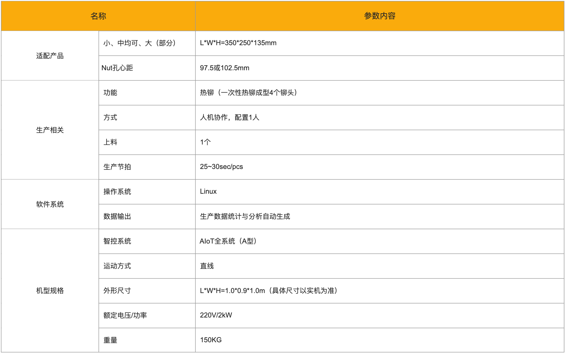 規(guī)格 | 功能 | 產(chǎn)品適配 | 生產(chǎn)節(jié)拍,sec/pcs | 整機尺寸,m | 重量,KG | 電壓,V/功率,kW | 備注 | 詳情 |