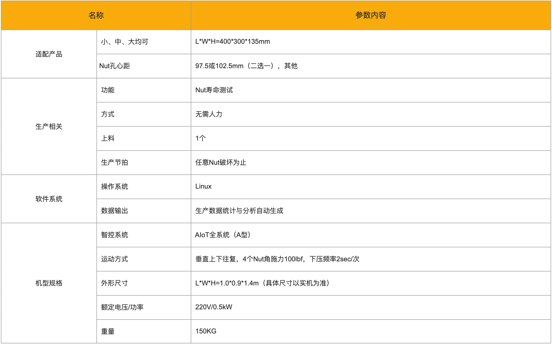 N | 壽命檢測 | 小/中/大 | 任意Nut破壞為止 | 1*0.9*1.4 | 150 | 220/0.5 | 關聯(lián)AI預測 | 點擊詳情> |